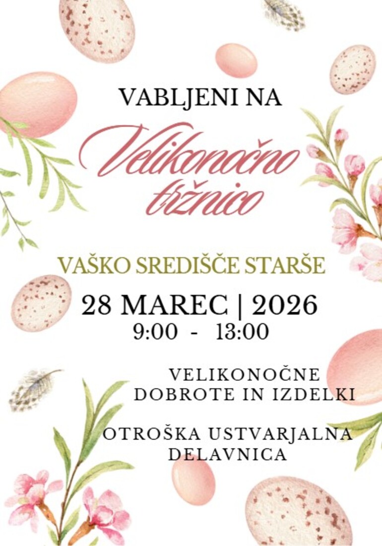 Društvo Ajda Starše vas vabi, da jih obiščete na Velikonočni tržnici, ki bo v soboto, 28. 3. 2026, na Vaškem središču v Staršah od 9.00 do 13.00 ure.